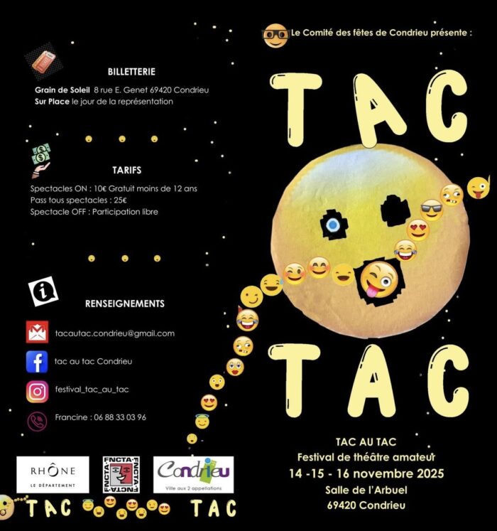 Le Festival TAC au TAC est une institution 100% condriote. Initié par le comité des fêtes et sa section théâtre dont le pilote est Francine MANE-BALLARD. Il connait un succès grandissant chaque année en octobre et sa dernière édition fût remportée par la Compagnie des 400 coups de Brignais.