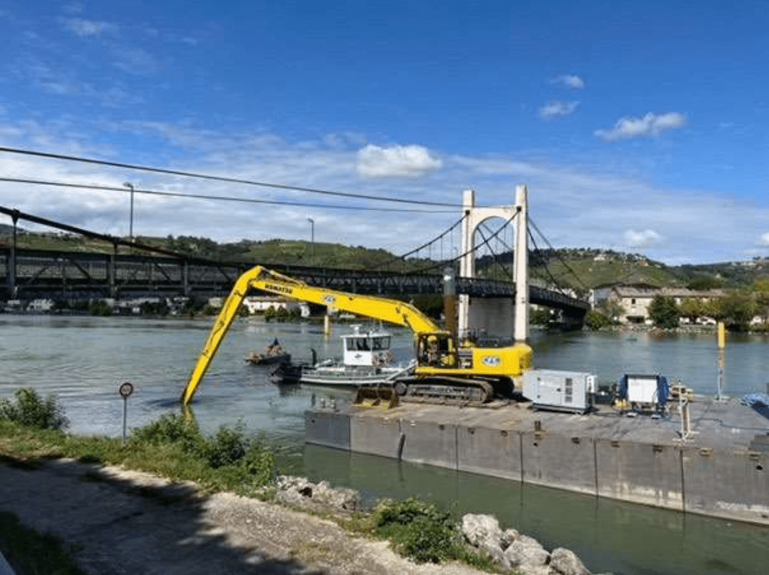 Il s’agit d’enfoncer des tubes de 25 mètres de long dans le fond du lit du Rhône sur une profondeur de 7 à 8 mètres, à l’aide d’un appareil spécifique (le vibre-fonceur).